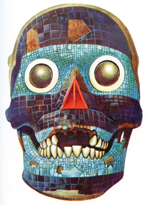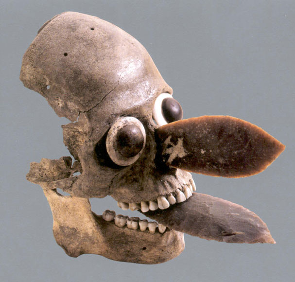 It wasn’t only the natives of New Guinea who liked to decorate skulls; Neolithic crania from approximately 12,000BC have been discovered in the eastern Mediterranean decorated with Dentalium shells. On the other side of the Pacific the Aztecs covered complete skulls in turquoise and other materials. One of the most famous of these is thought to represent the god Tezcatlipoca, or ‘Smoking Mirror’; one of the four powerful creator deities who were amongst the most important of their gods. They also used to cut the facial bones from their victim’s skulls and make ritual masks from them.