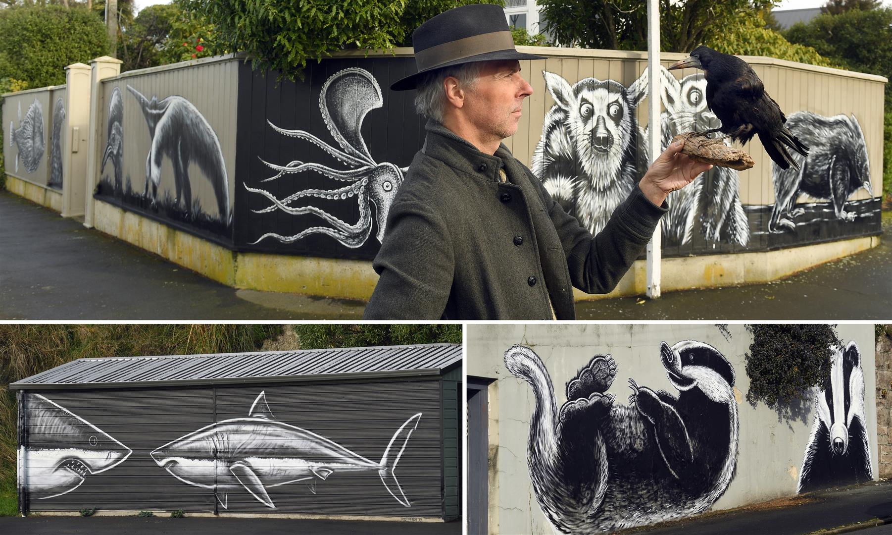 45. Three animals from the Animal Attic at Otago Museum on a private wall in Easther Crescent above St Clair. They are from left – a Queensland Groper – a Cancer Crab – and a freshwater crayfish(koura).