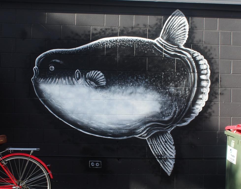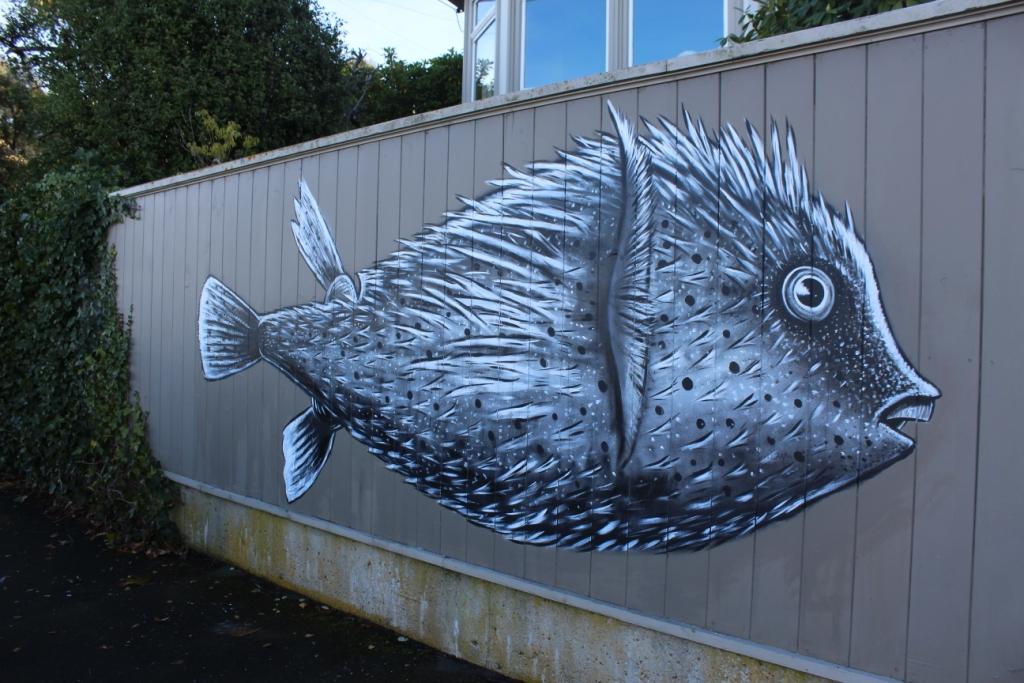 13) Hoowinker Sunfish – on the side of The Lead Balloon Cafe on the One Way System. It’s based on the cast of the one on display in the foyer at Otago Museum. May 2019.