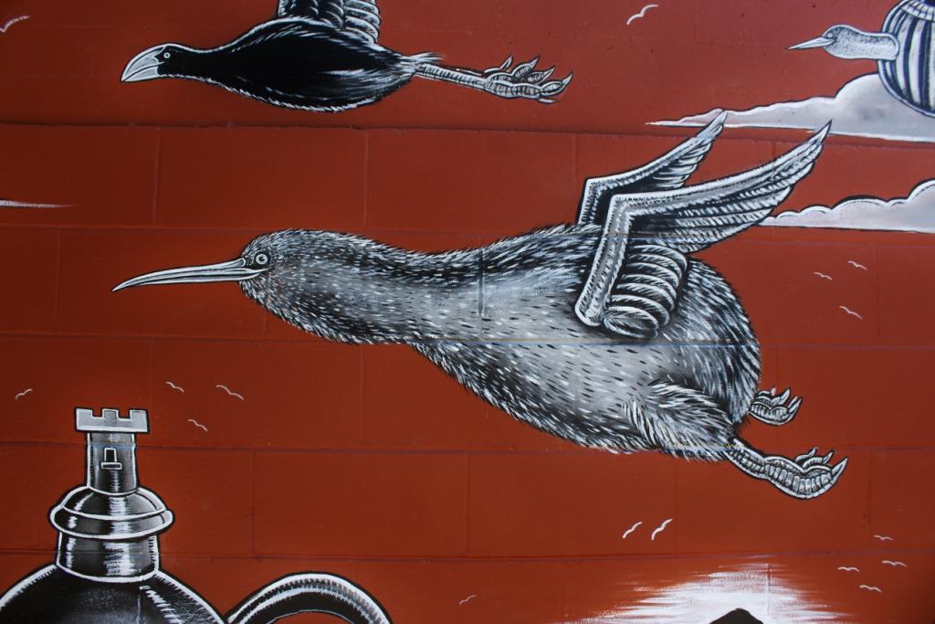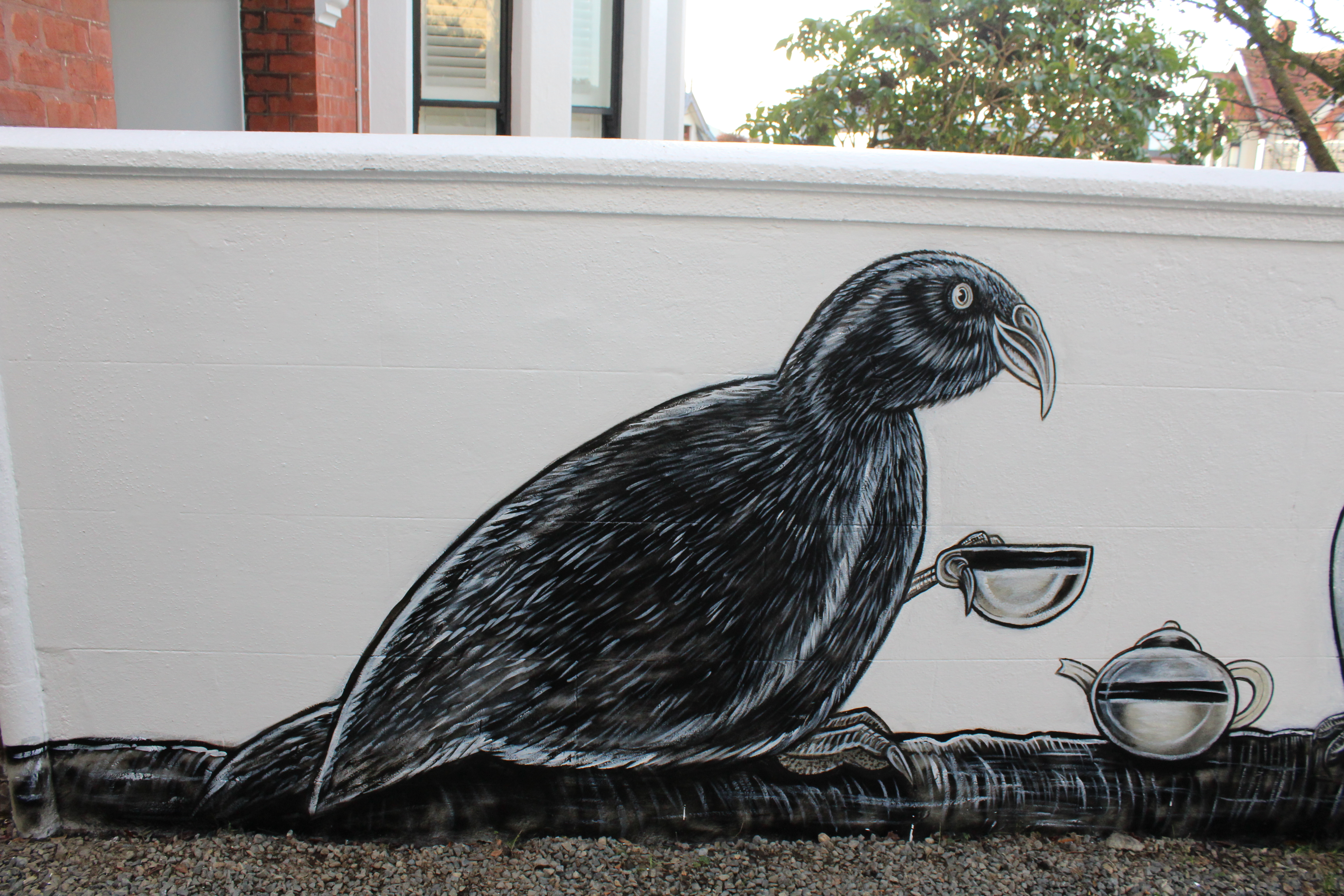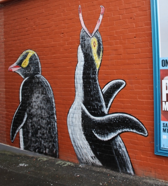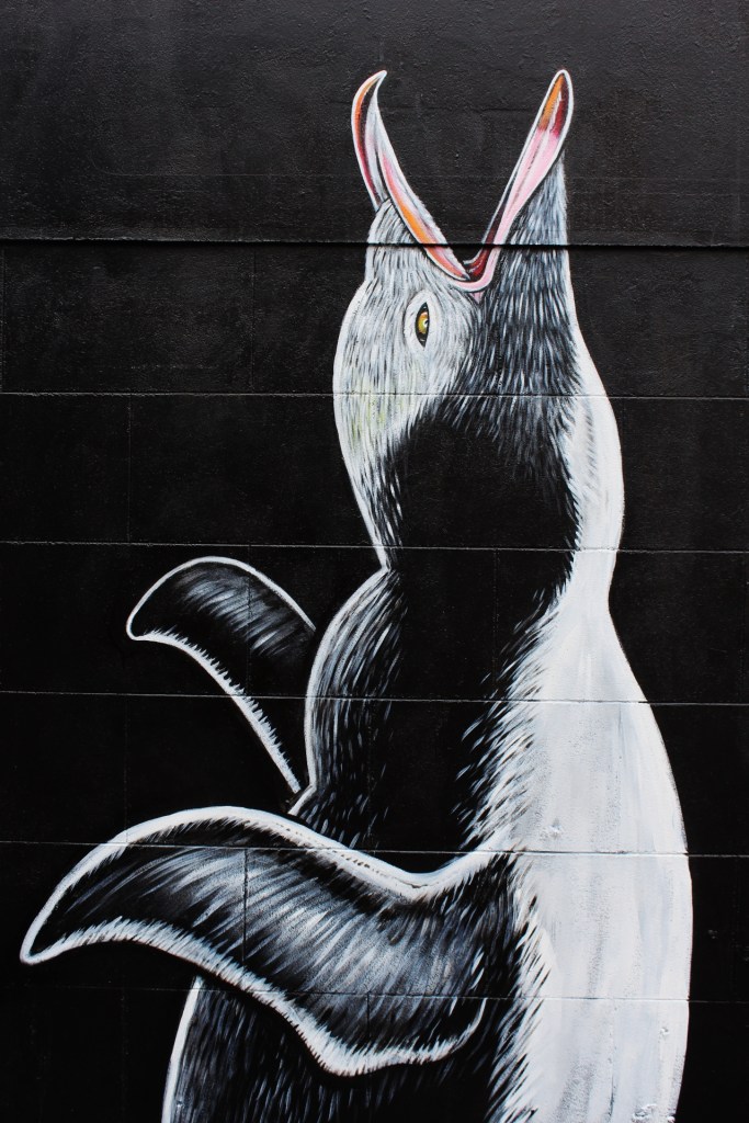 - Yellow-eyed penguins on George Street. This was the first mural I painted a few weeks after I’d moved back. It was organized by Phantom Bill Stickers. My partner says it’s terrible and that the beak on the right hand penguin is all wrong. I agree – it is a bit weird. This was covered in a big tag in August 2021 and I painted the Lawrence Lions over it (see #26 below).