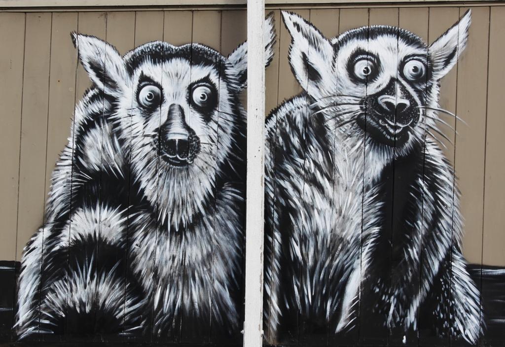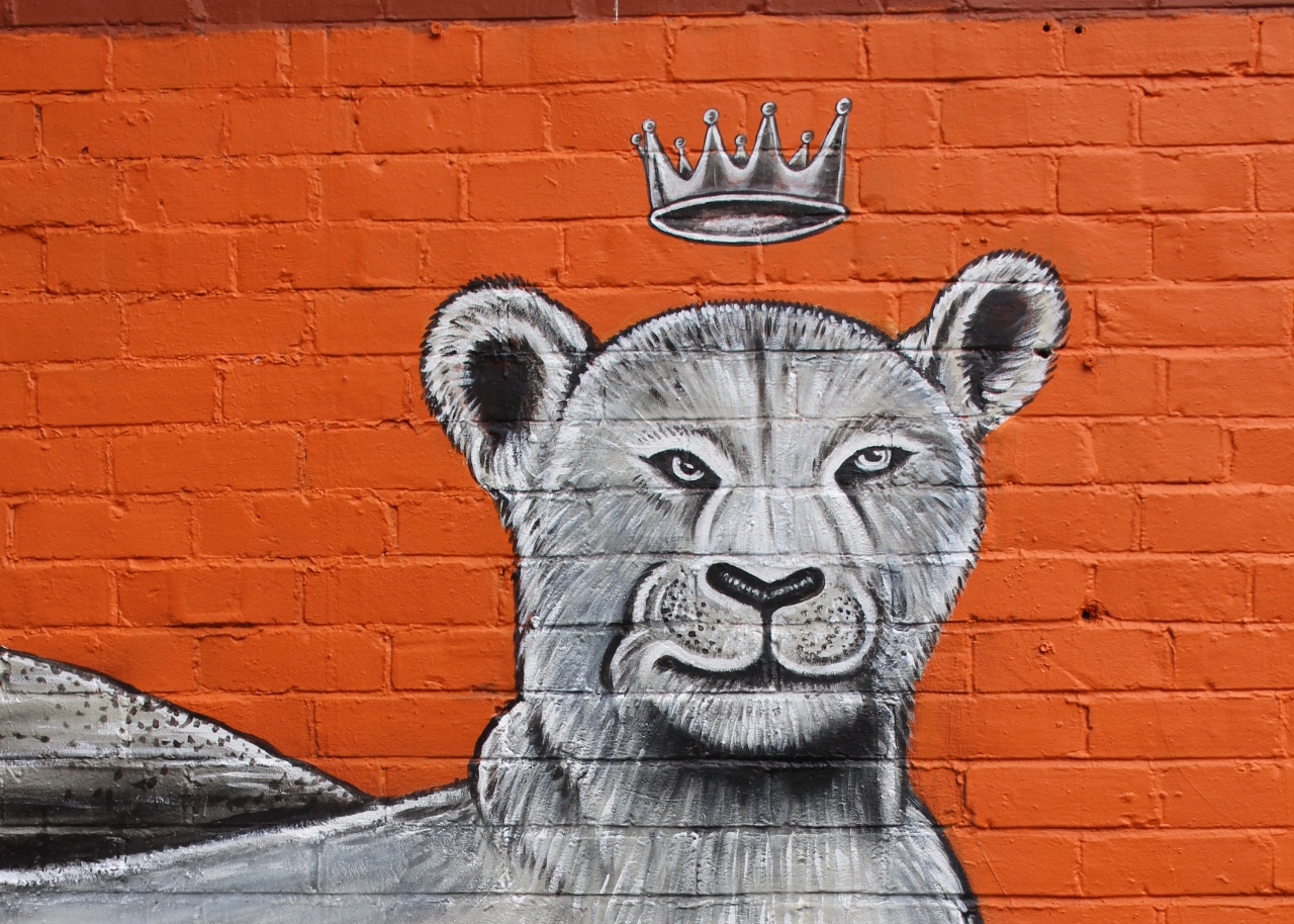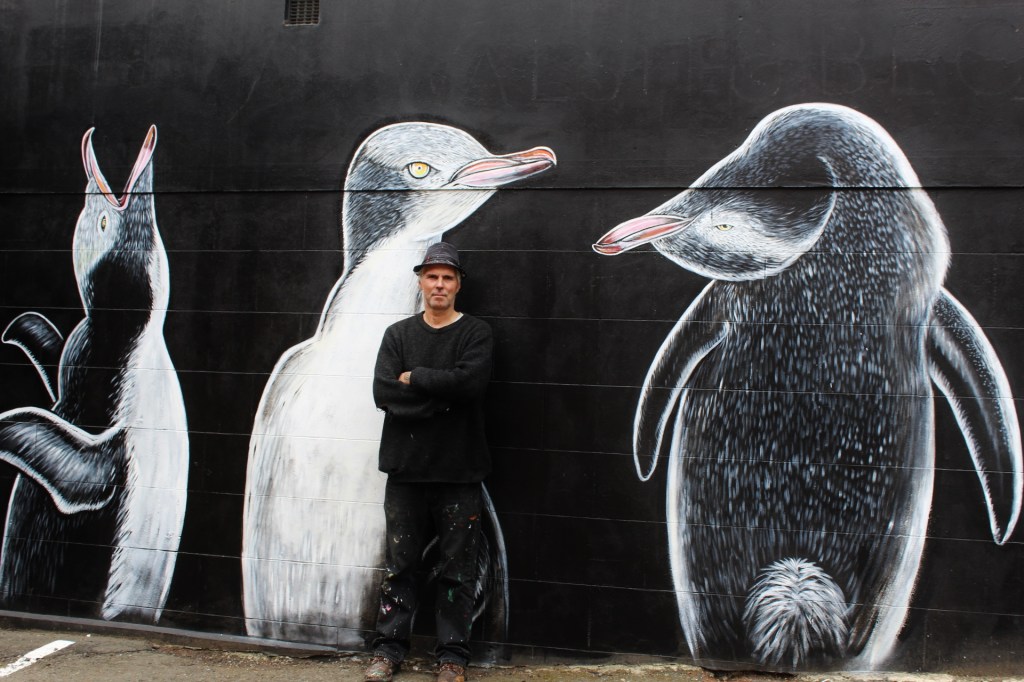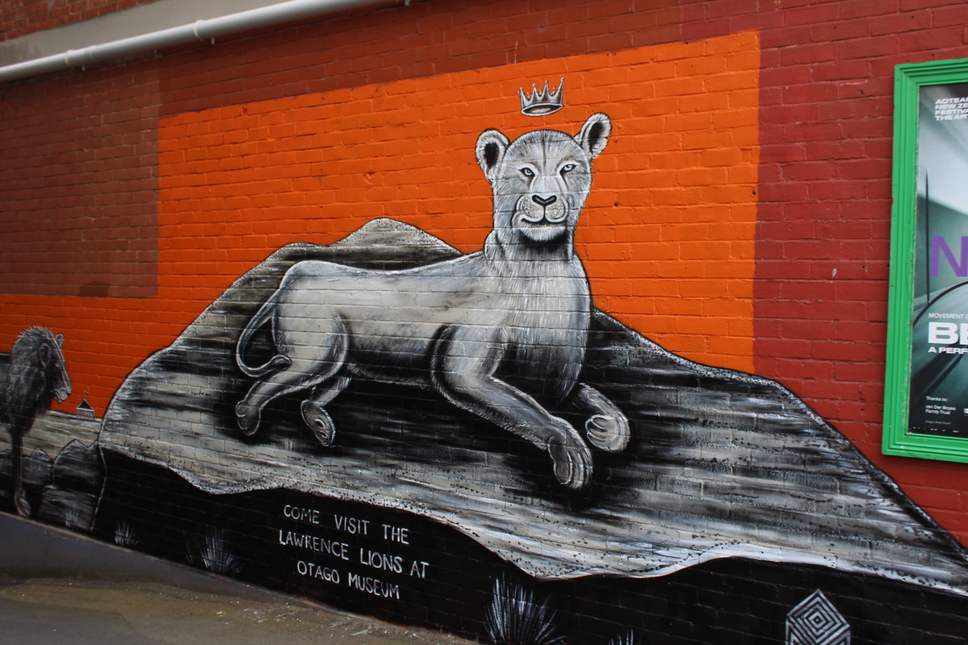- Yellow-eyed penguins on George Street. This was the first mural I painted a few weeks after I’d moved back. It was organized by Phantom Bill Stickers. My partner says it’s terrible and that the beak on the right hand penguin is all wrong. I agree – it is a bit weird. This was covered in a big tag in August 2021 and I painted the Lawrence Lions over it (see #26 below).