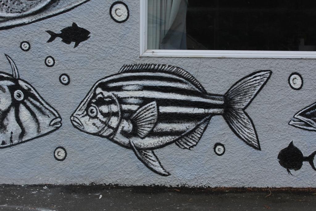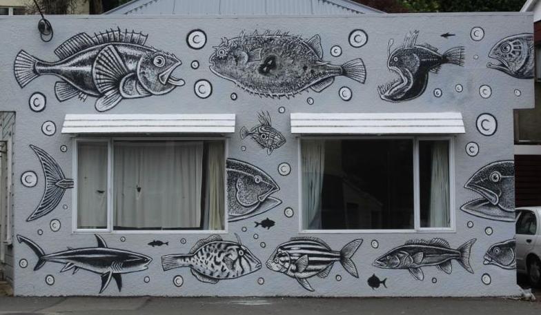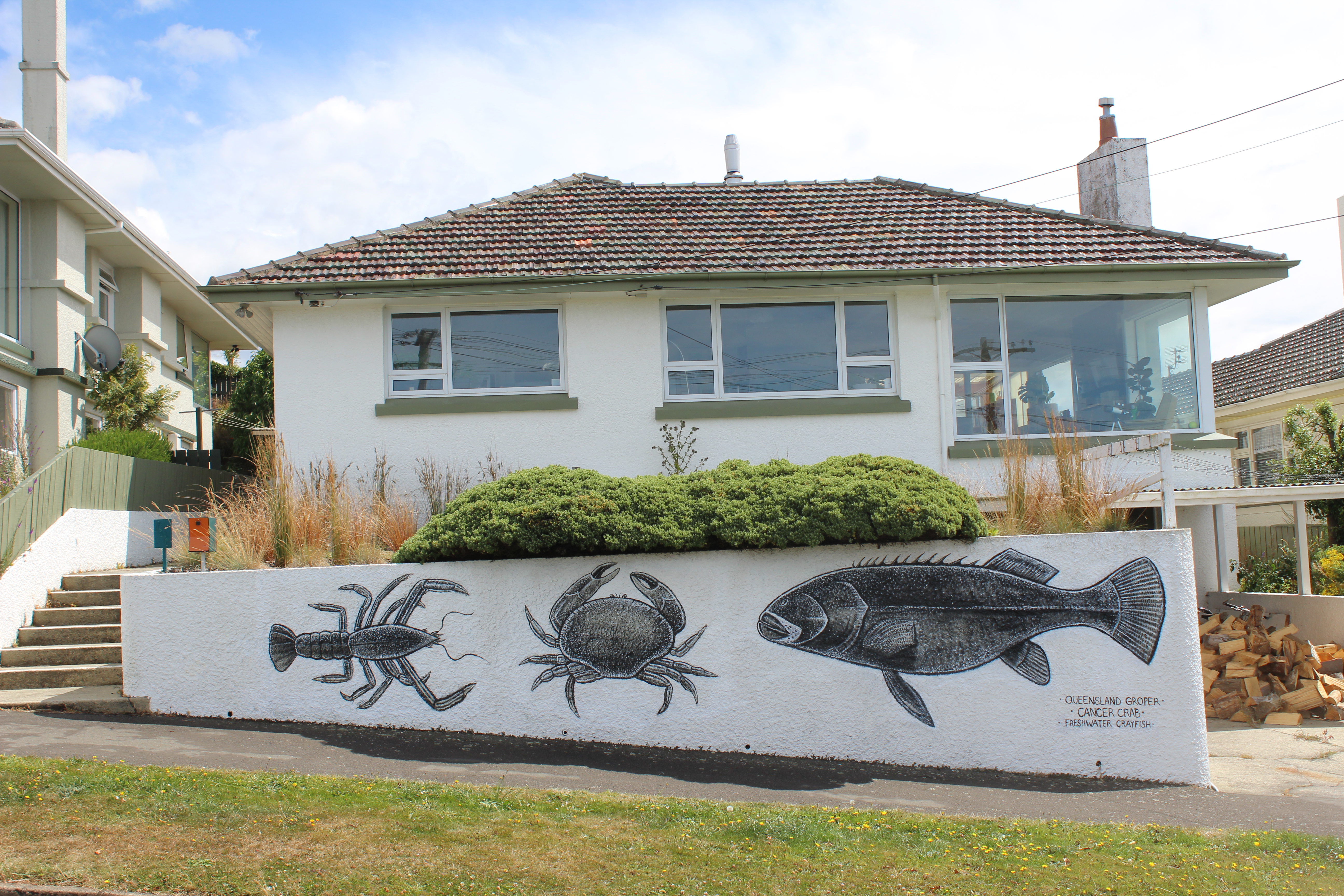 11) NZ Coastal Fish (as well as a deep sea angler fish) on the side of a private house in North Road in North East Valley. Private Commission January 2019.