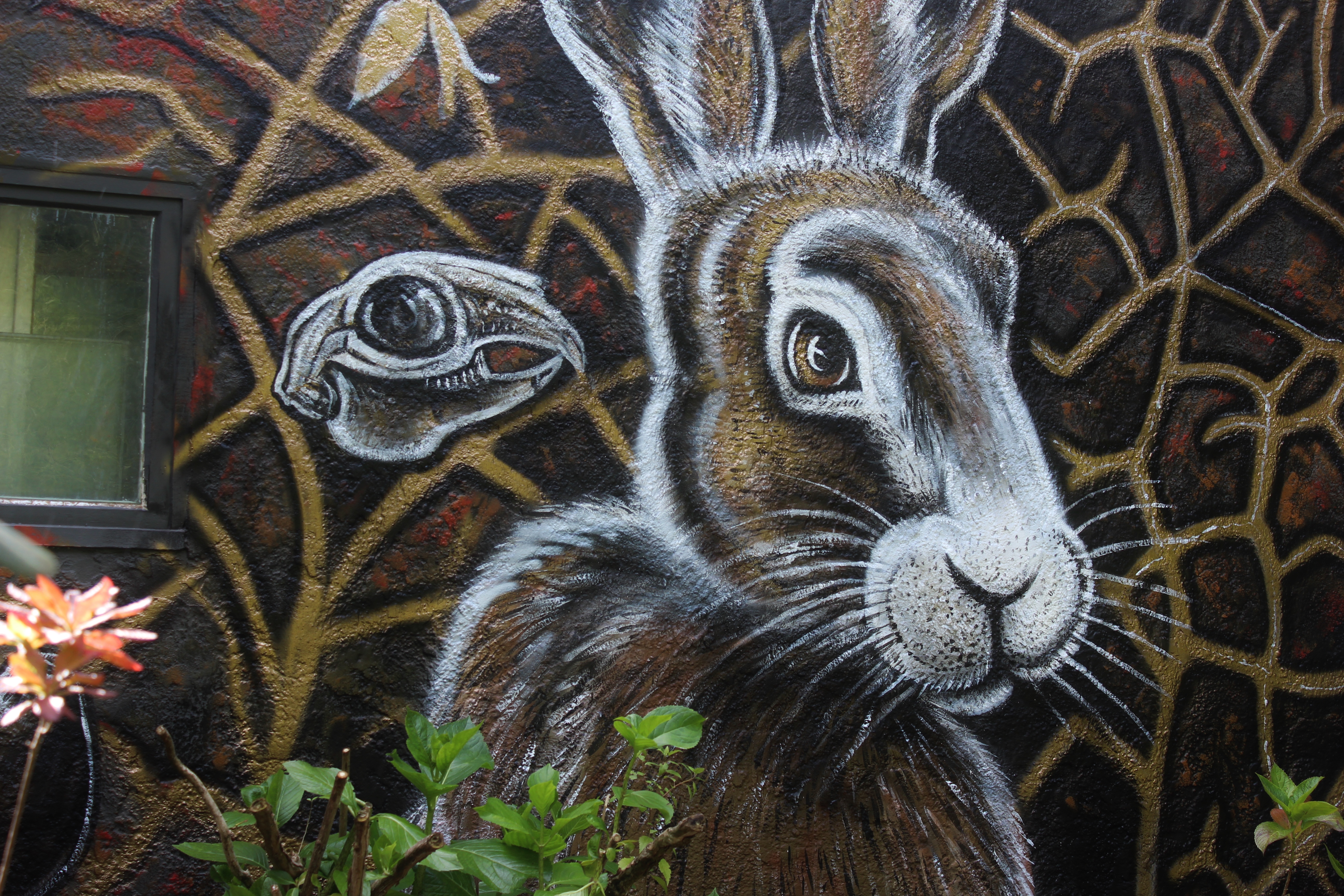 12) Hares and other objects belonging to the owner(including the rabbit skull to the left of the hare) on the side of a private garage in Port Chalmers. This is only a detail of the right side of the wall. May 2019.