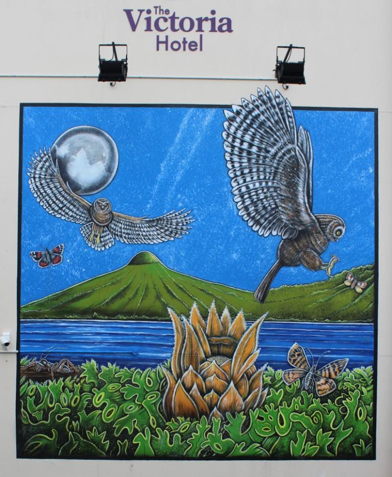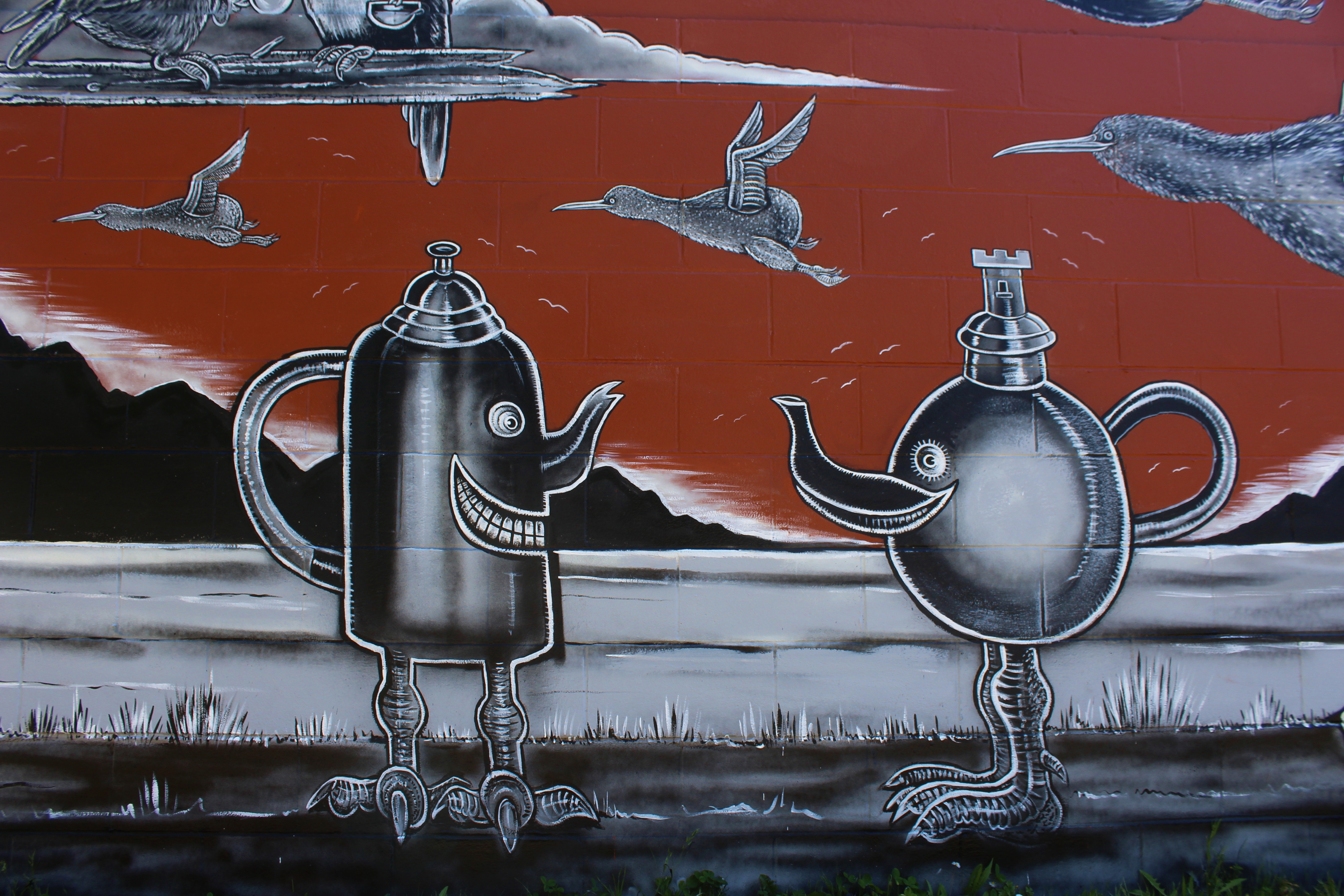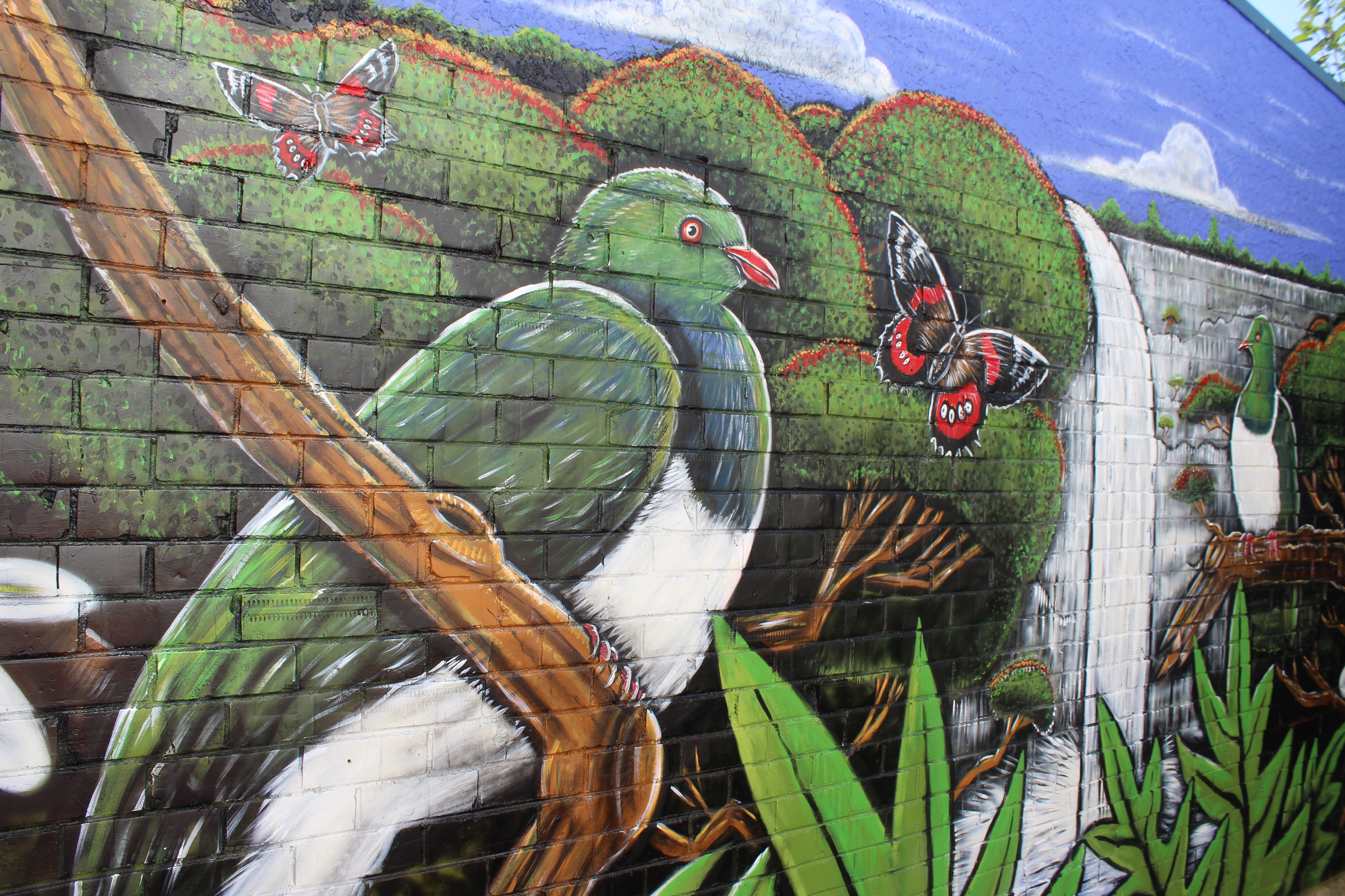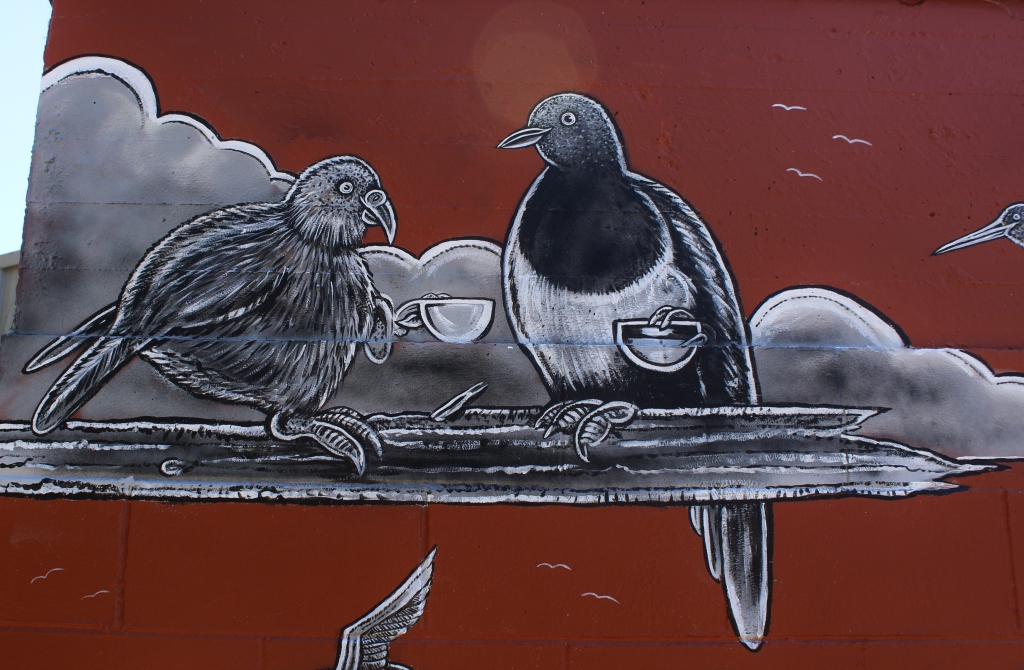 17) Flying Kiwi’s, Crazy Tea pots and other native birds on the side of the Waitati Hall. Commissioned by Mandy Mayhem and the Waitati Community Board. December 2020.