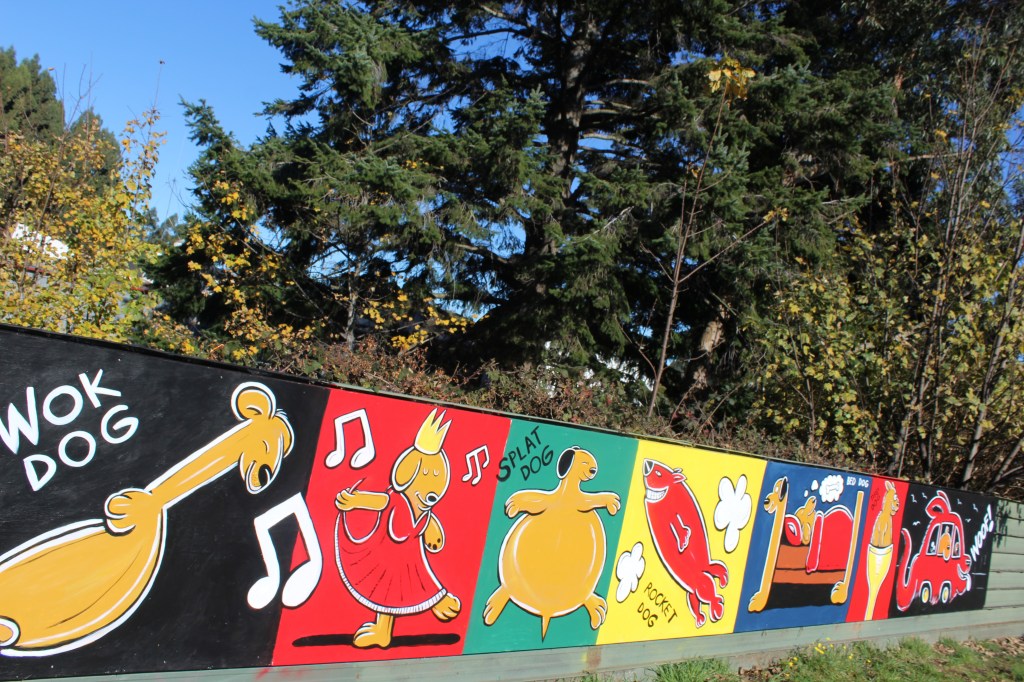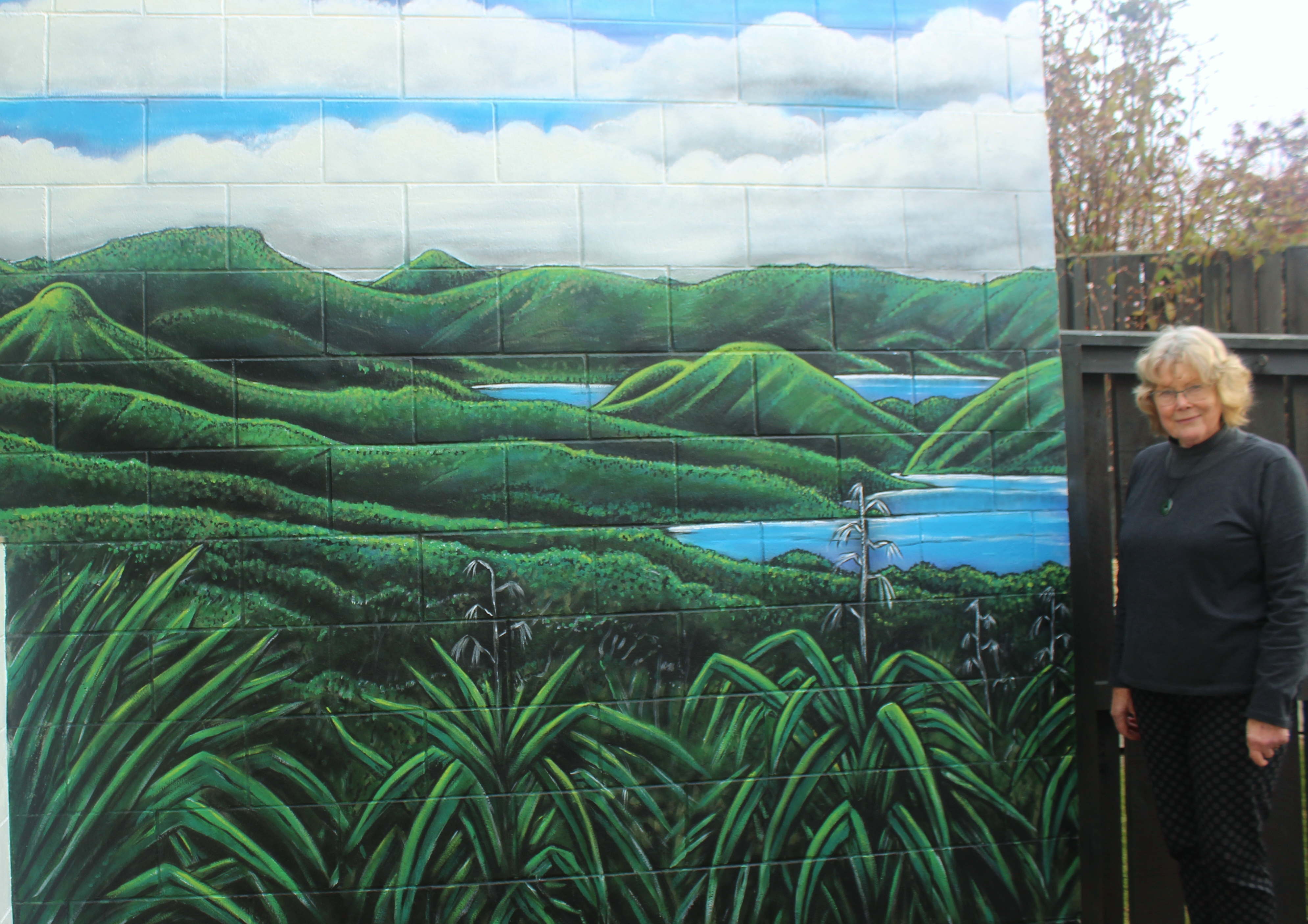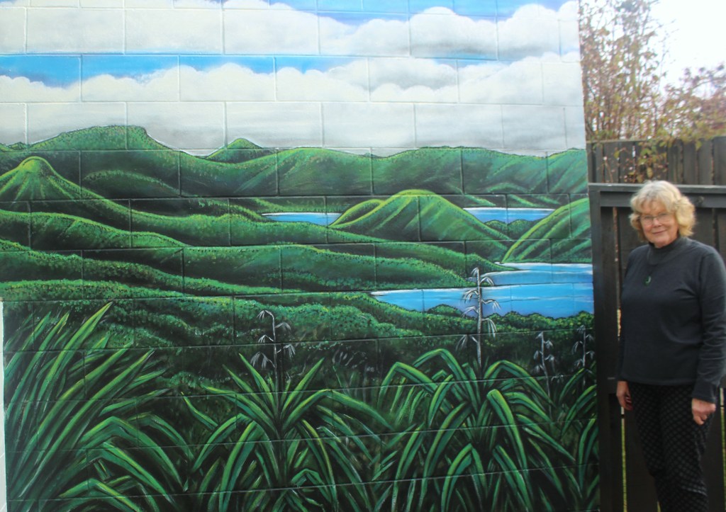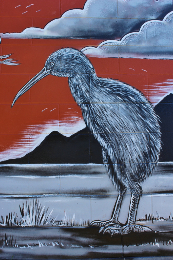 17) Flying Kiwi’s, Crazy Tea pots and other native birds on the side of the Waitati Hall. Commissioned by Mandy Mayhem and the Waitati Community Board. December 2020.