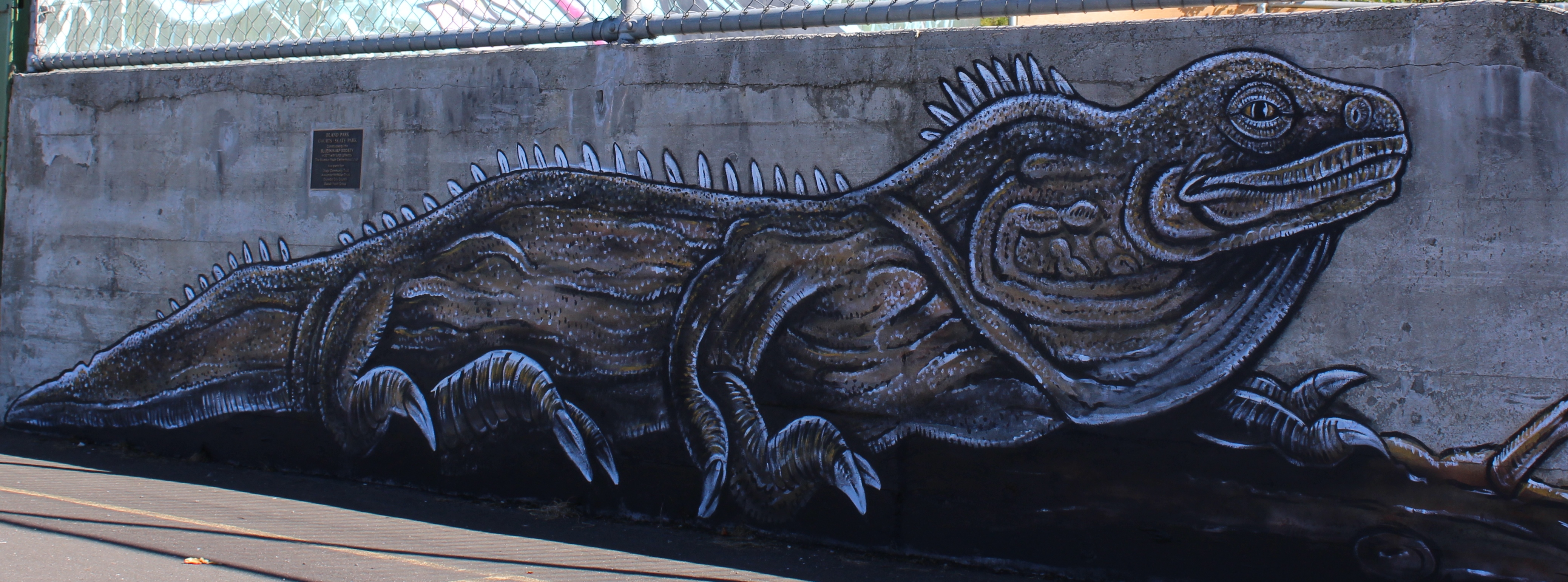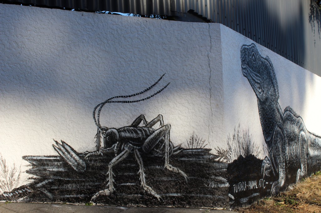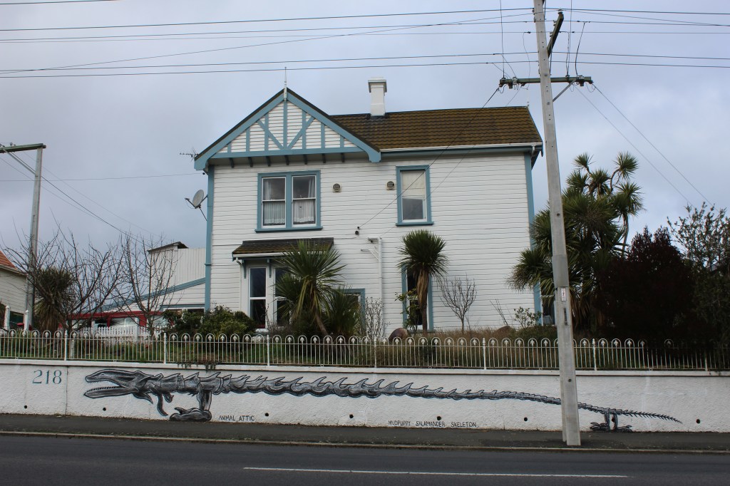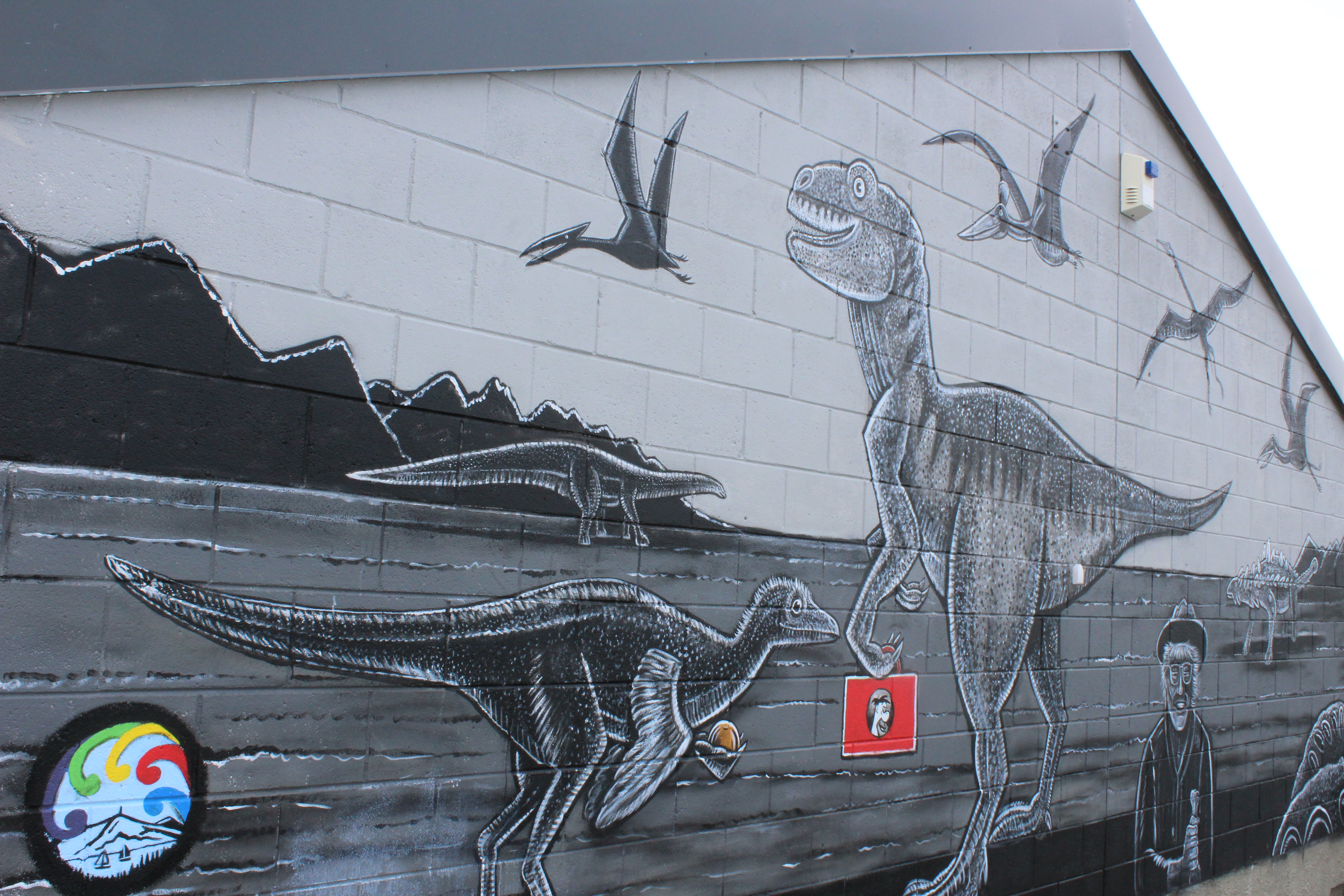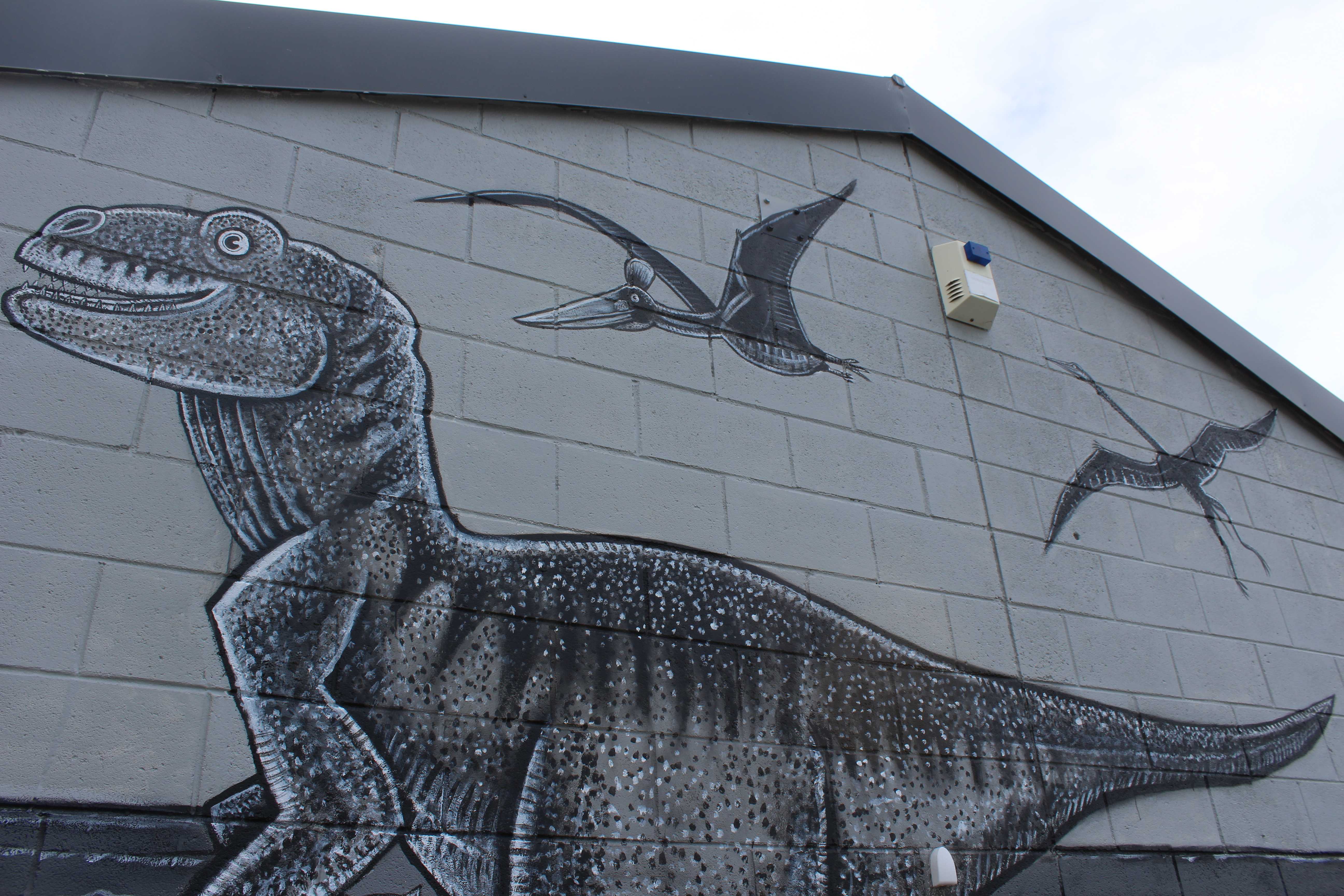 15) Theropod dinosaur on the side of Crusty Corner in North East Valley. Commissioned by Otago Museum to promote a travelling exhibition. September 2020. I’m keen to paint something else on this wall.