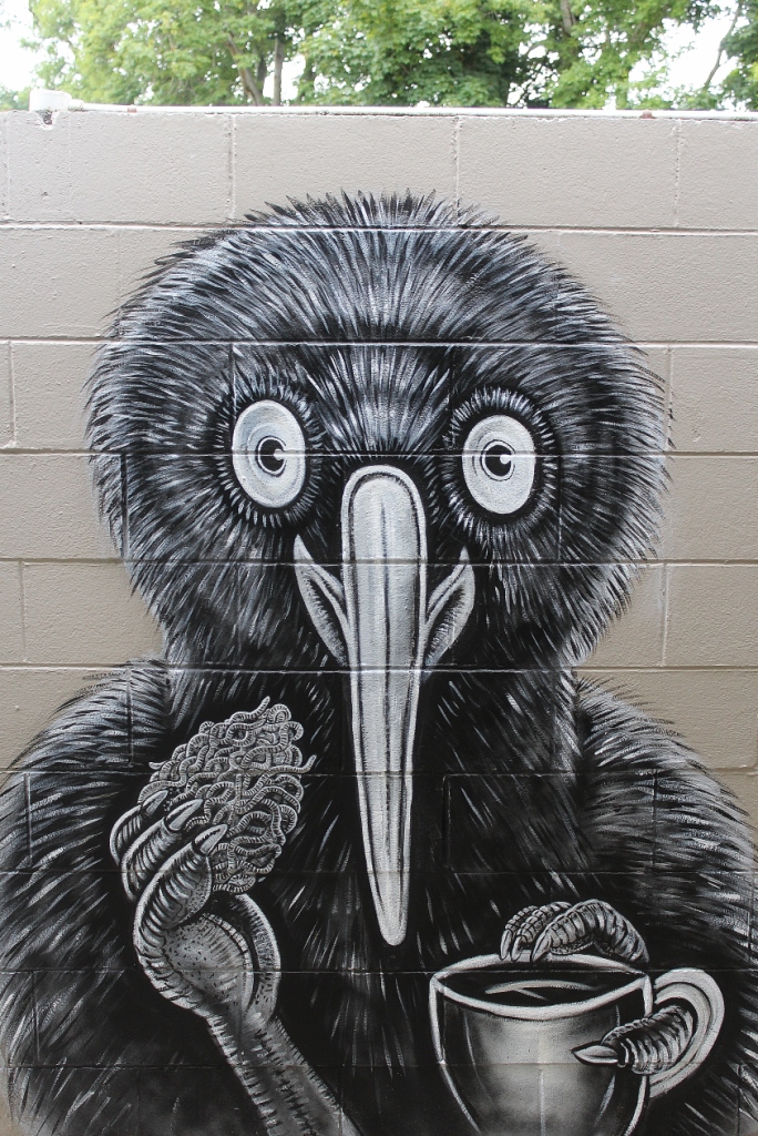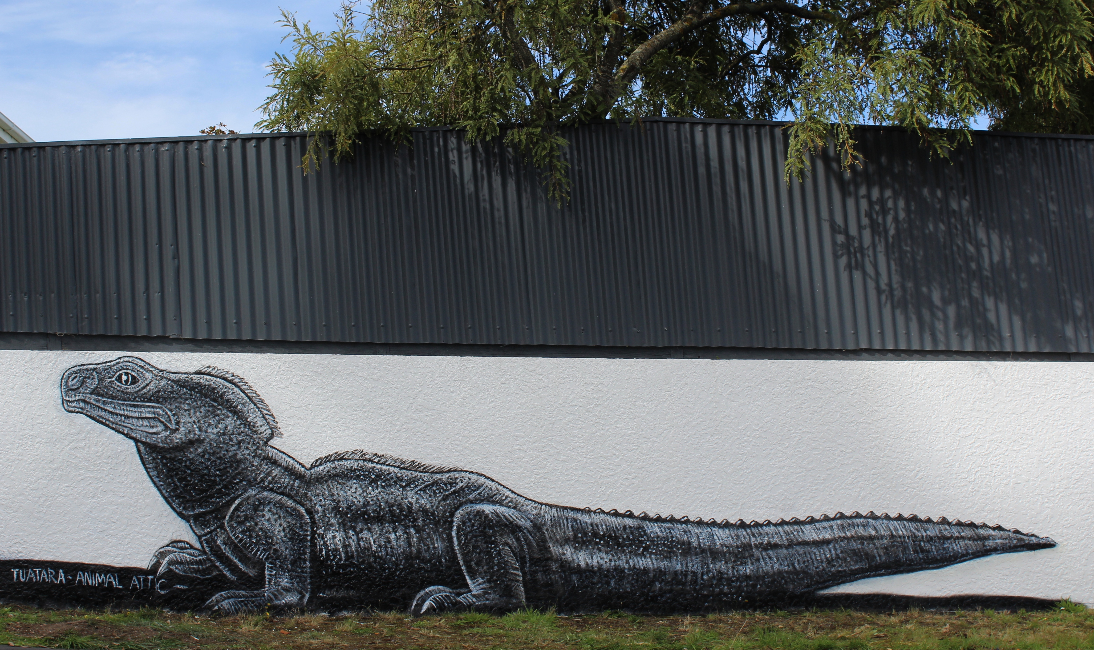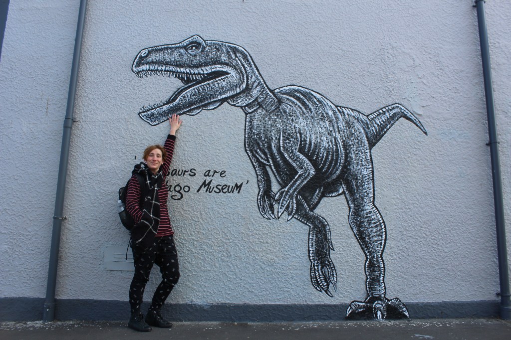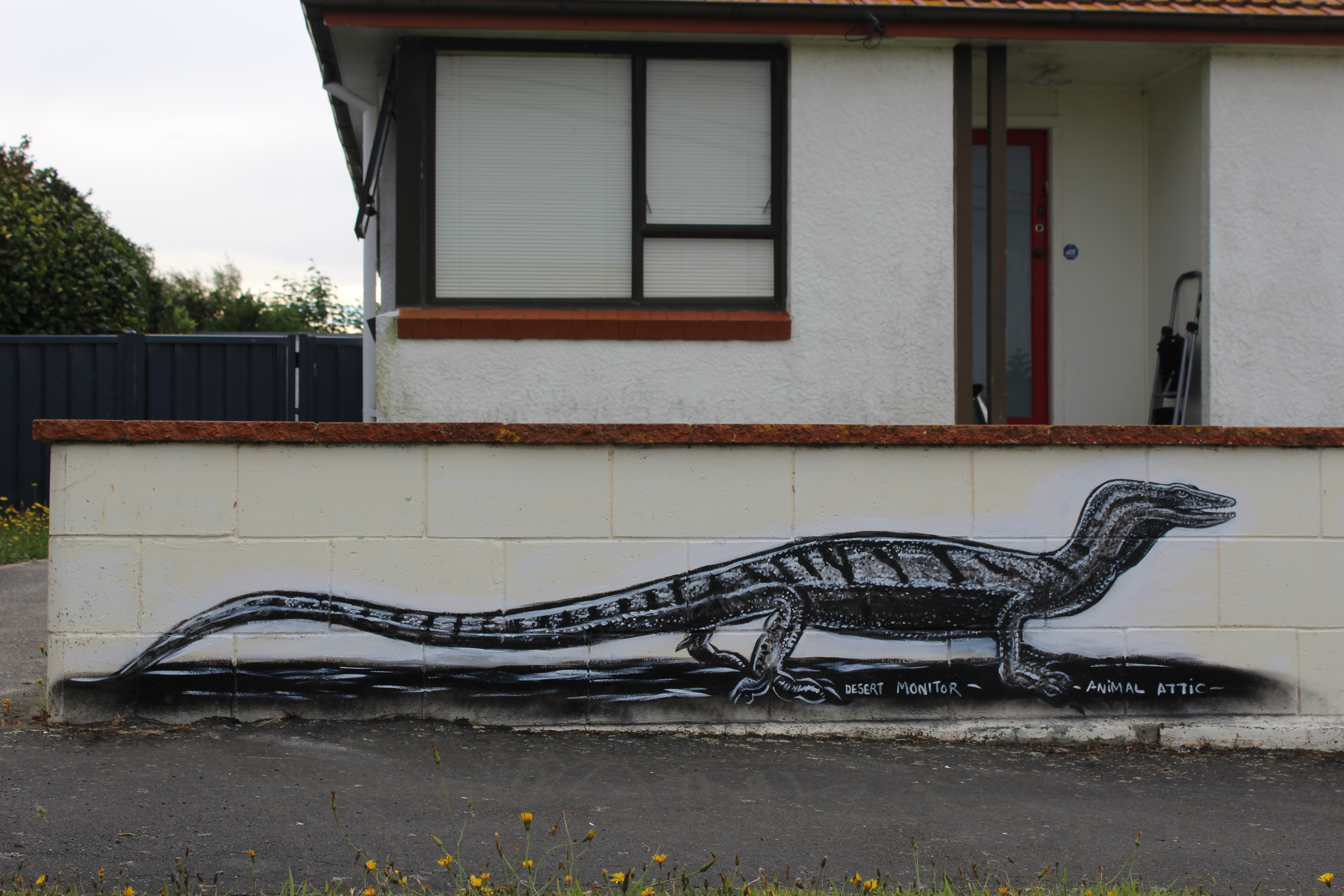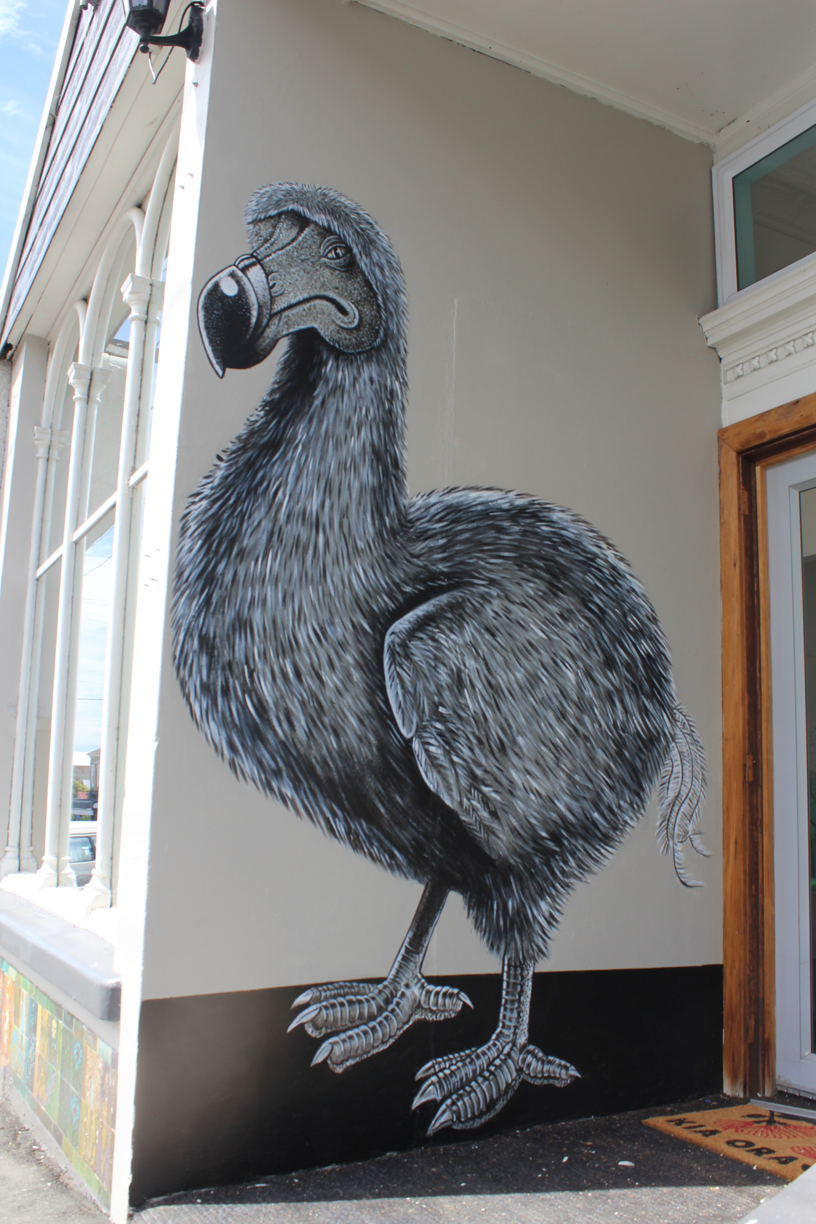 15) Theropod dinosaur on the side of Crusty Corner in North East Valley. Commissioned by Otago Museum to promote a travelling exhibition. September 2020. I’m keen to paint something else on this wall.