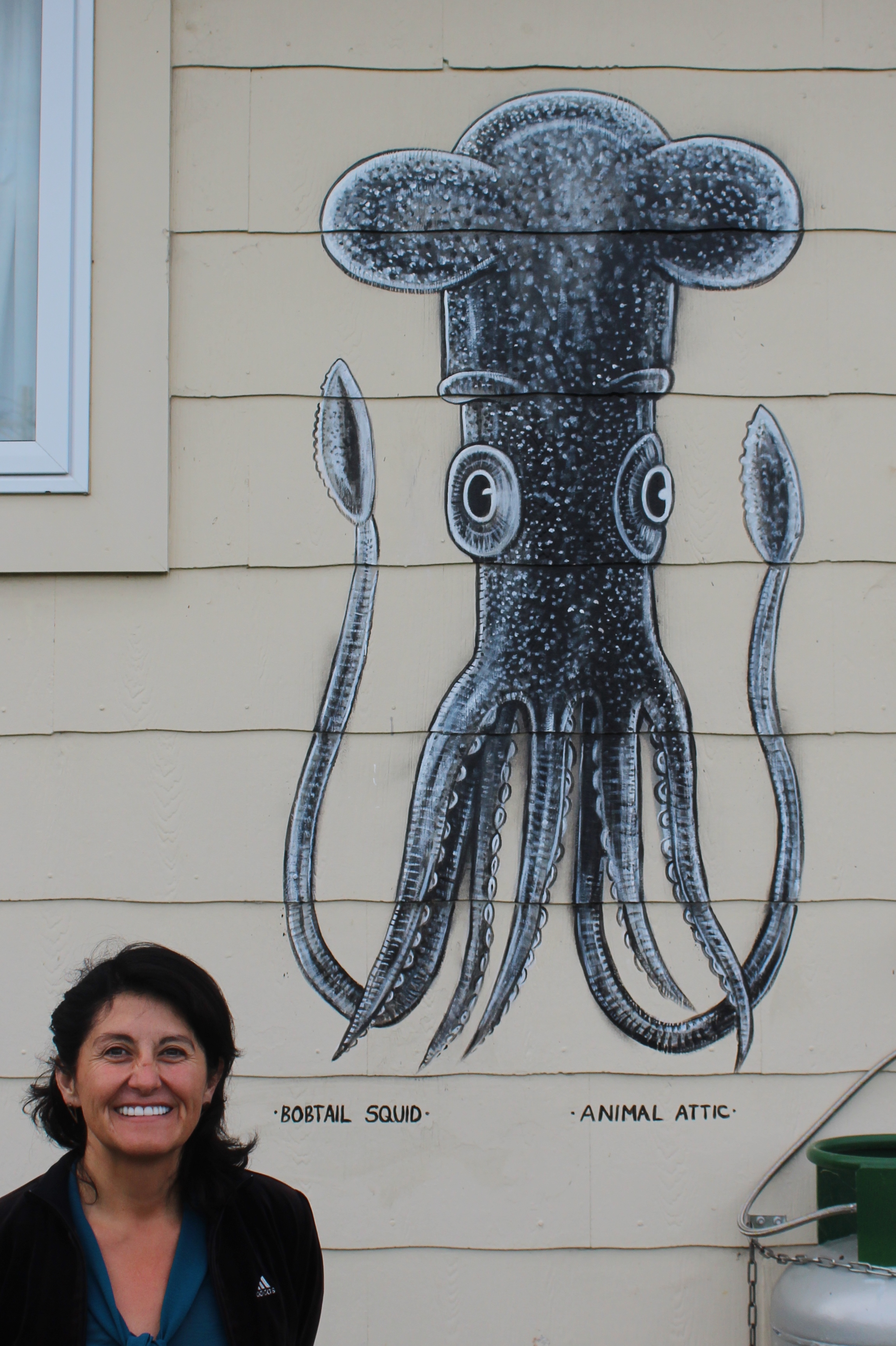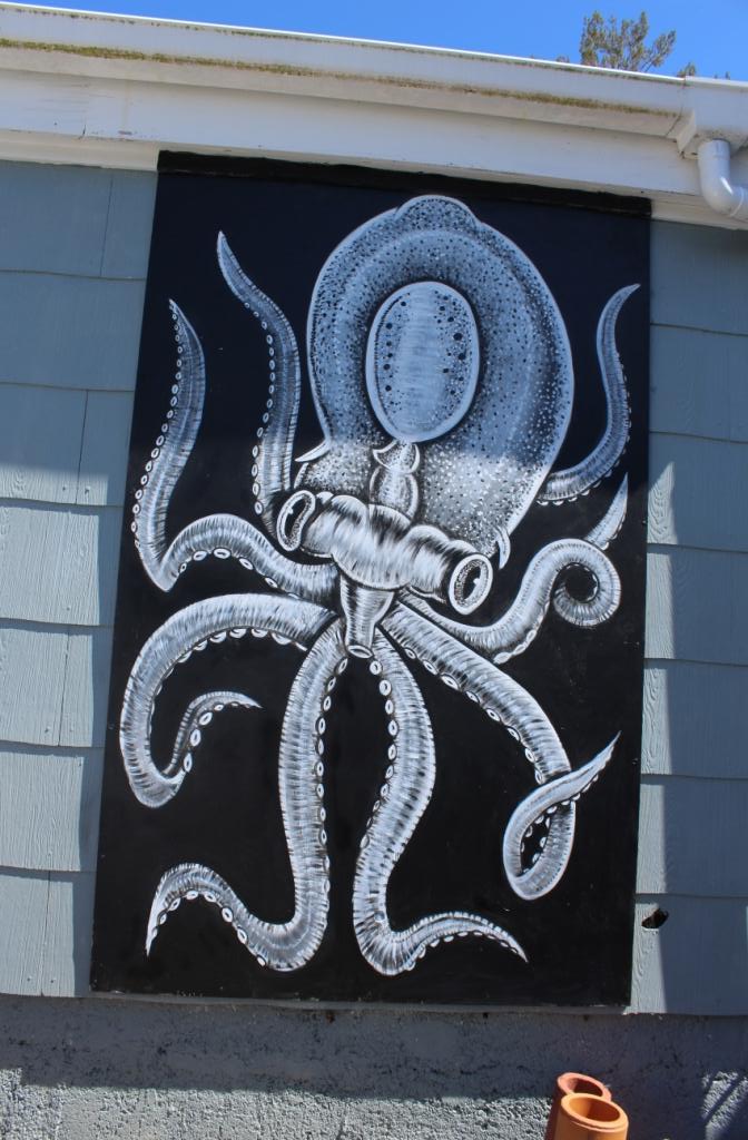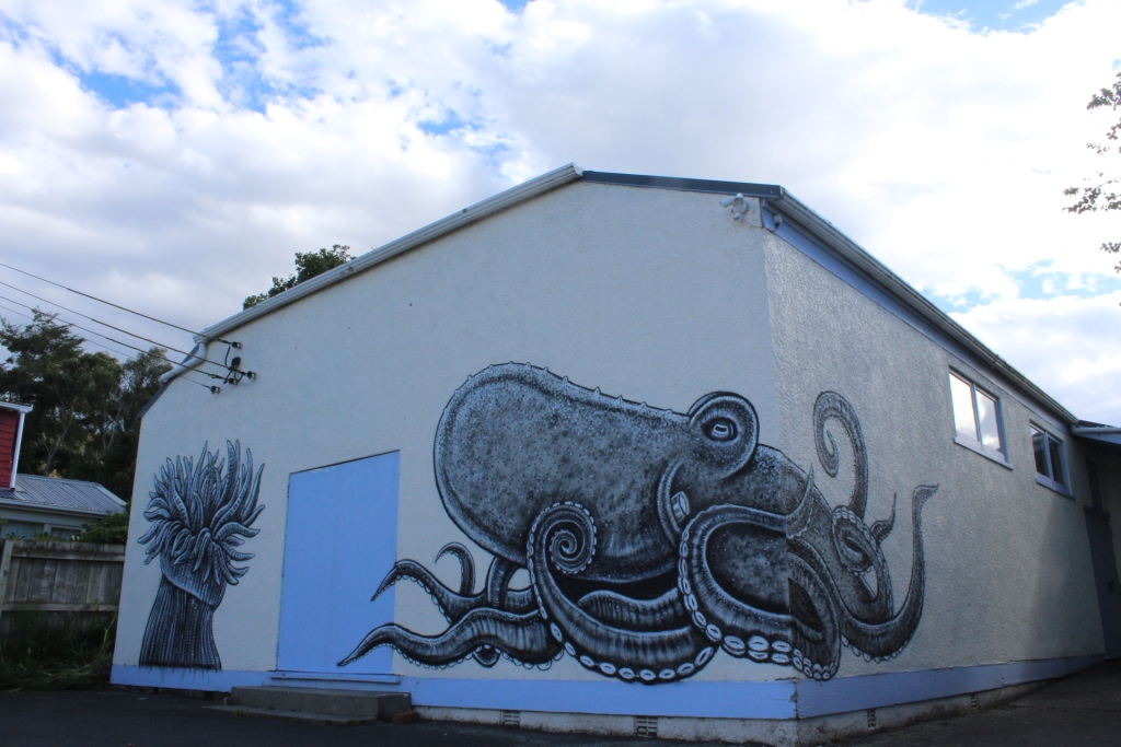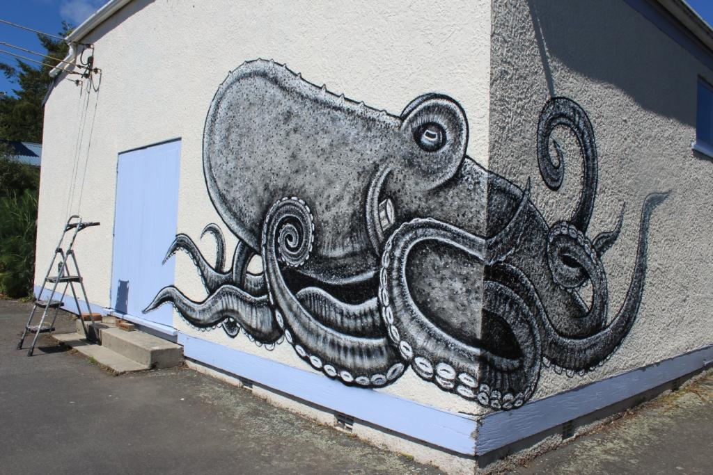 19) A giant wheke (octopus) crawling round the side of the Broad Bay Hall. Organized by Amber and Zoe and the Broad Bay Community. Painted on Boxing Day 2020.