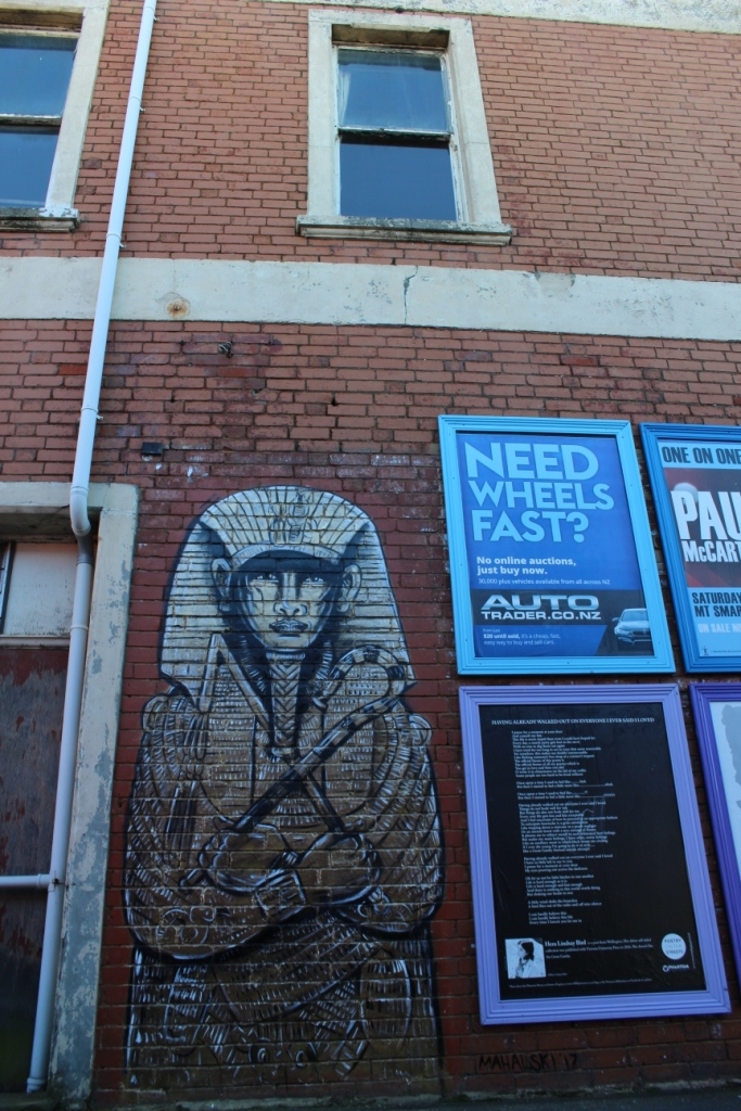 2. Tutankhamun inspired Egyptian sarcophagus on a wall on the corner of King Edward Street and Sullivan Avenue in South Dunedin. It was painted in the middle of winter in 2027 using gold spray paint and black acrylic. Also for Phantom Bill Stickers. It’s actually lasted really well and still looks good.
