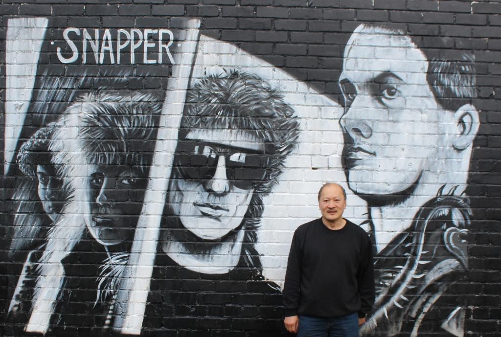 4) Snapper Mural – on the side of the Crown Hotel in Rattray Street. This mural of the famous Dunedin band was commissioned by Jones Chin (pictured) in May of 2018. I used a photo he lent me as the reference. Peter Gutteridge (with the glasses) and drummer Alan Haig (right) were easy but Christine Voice and Dominic Stone were harder because they’re almost hidden in the photo. Peter and I used to be good buddies back in the day.