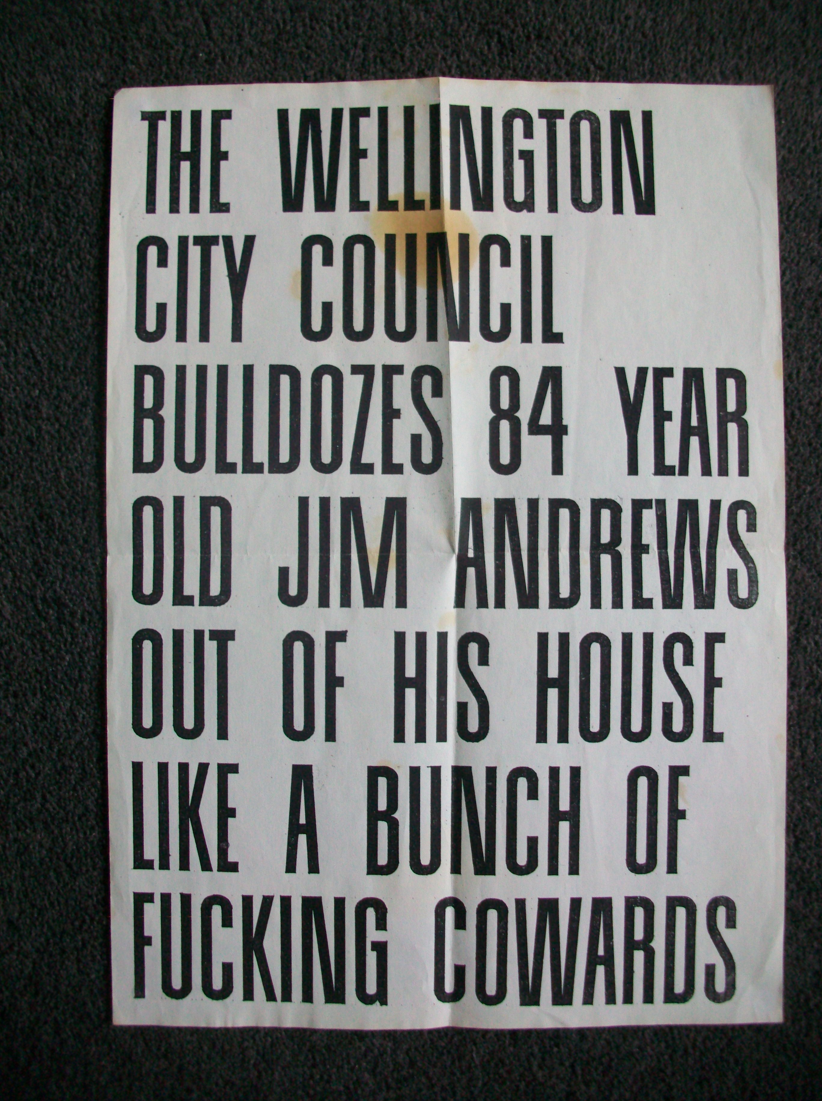 It was produced by Martin Thompson in 1990 to protest the construction of the Wellington urban motorway. A few years later this road cut a gaping chasm through town and destroyed our natural habitat in Arthur Street and Tonks Avenue.