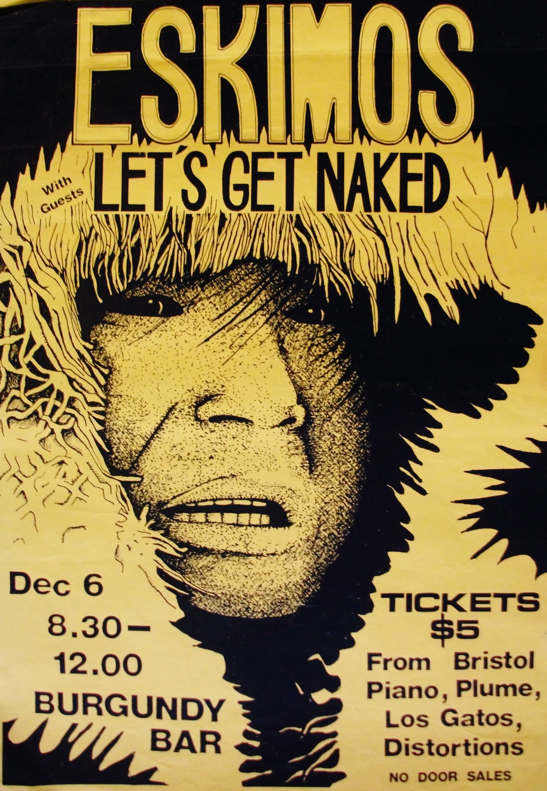 I drew this one back in ‘86 for a joint gig between my band (Let’s Get Naked) and a rare appearance by our good friends – ‘Eskimos’ – some of whom were also part of Let’s Get Naked. It was an incestuous little scene and things weren’t too PC back then either!