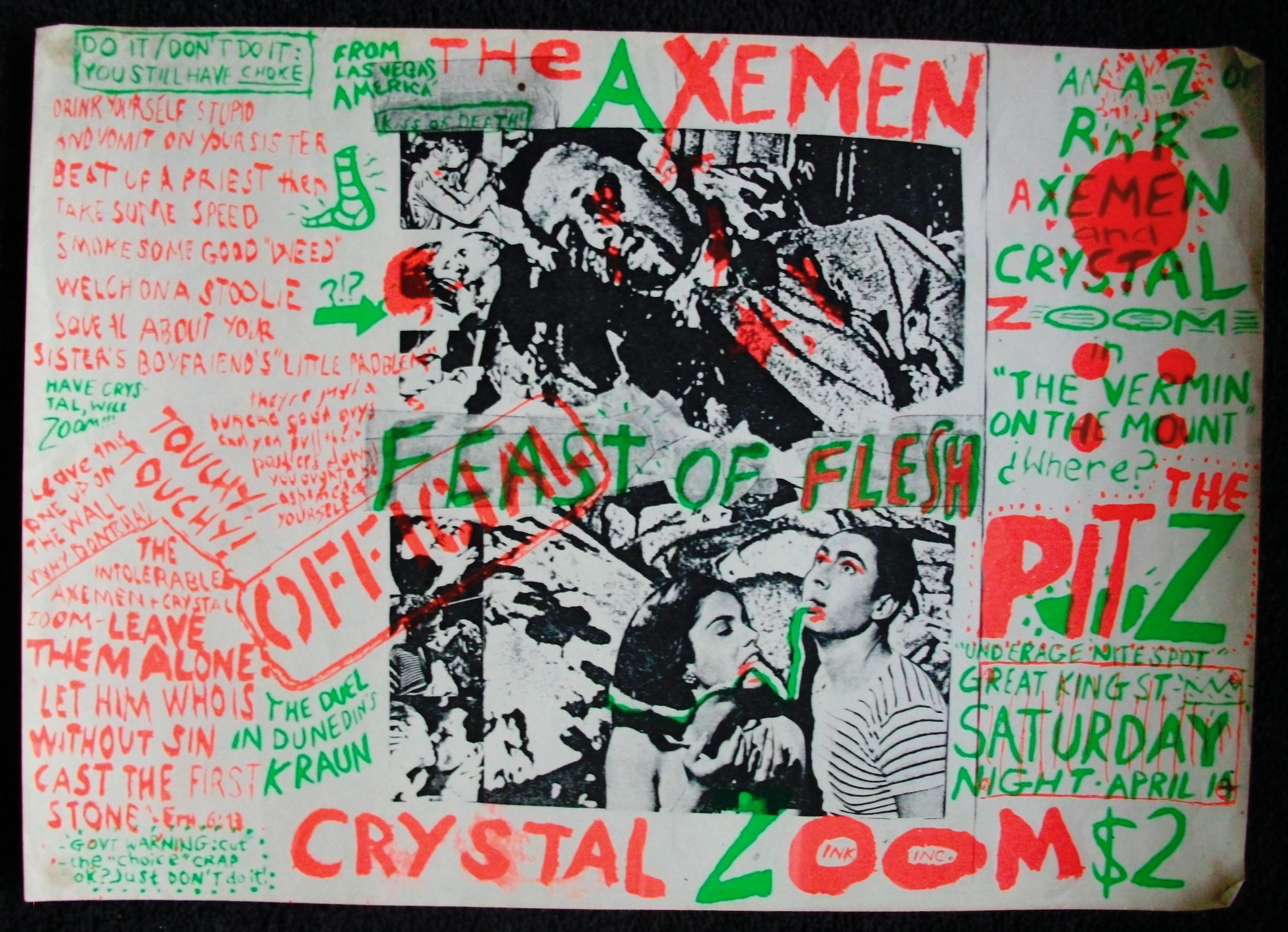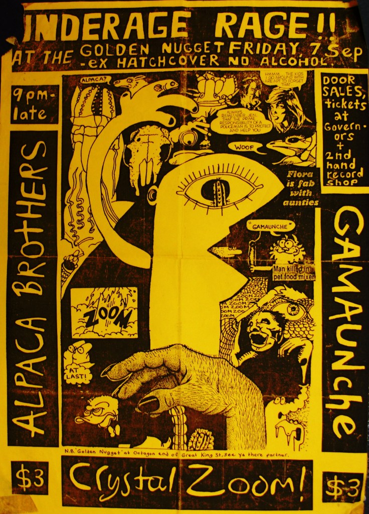 2)’Underage Rage’ – poster advertising a three band gig (‘Crystal Zoom’/’Gamaunche’/’Alpaca Brothers’) at Otago University in 1984.
