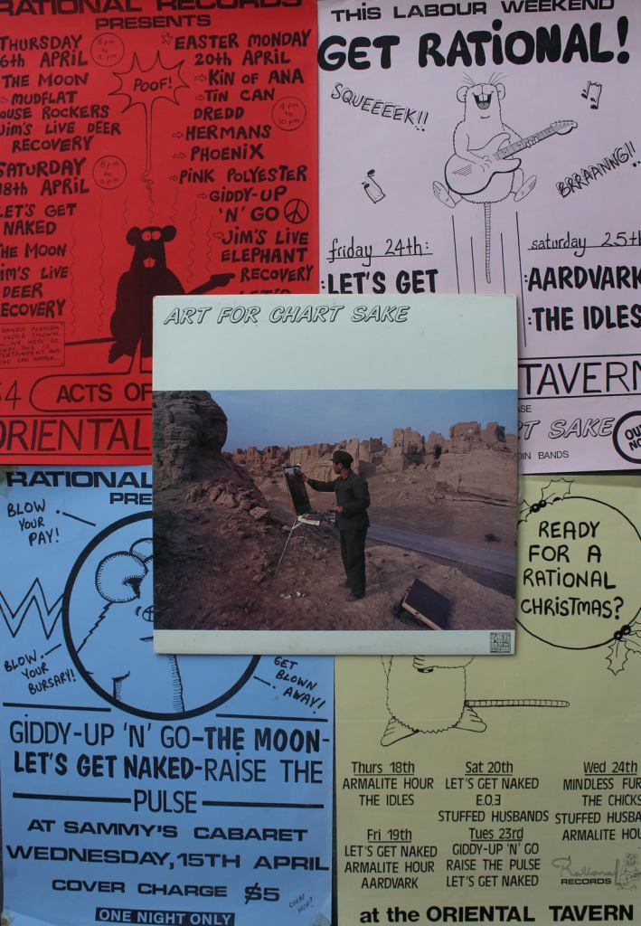 I stepped in pretty early to produce the record covers (usually with photos by Tom Sampson) and organized posters and promotional gigs to keep money and bands coming in. Most of the posters featured our mascot – Rational Rat. I can’t remember how many of these multi-band gigs I organized but probably around a dozen and many Dunedin bands played at them between 1986-88. Sadly Rational folded after putting out four LP’s. The whole thing was way too idealistic and Cam and I were too young and loose but it was a serious attempt to set up a record label like a non-profit communist collective – perhaps something slightly akin to Rough Trade records – but in the end not so successful.