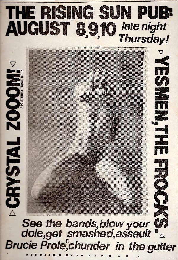This was Crystal Zoom’s final gig. We had been playing in Auckland/Waiheke Island for about nine months with our new rhythm section but things weren’t jelling and we knew it. I don’t remember much about these three nights except for ‘Rip It Up’ music reviewer, Russell Brown, telling me after one of them that I should give up on trying to be a singer/front man and concentrate on cartooning instead. A few weeks after this gig my partner died suddenly and I moved back to Dunedin.