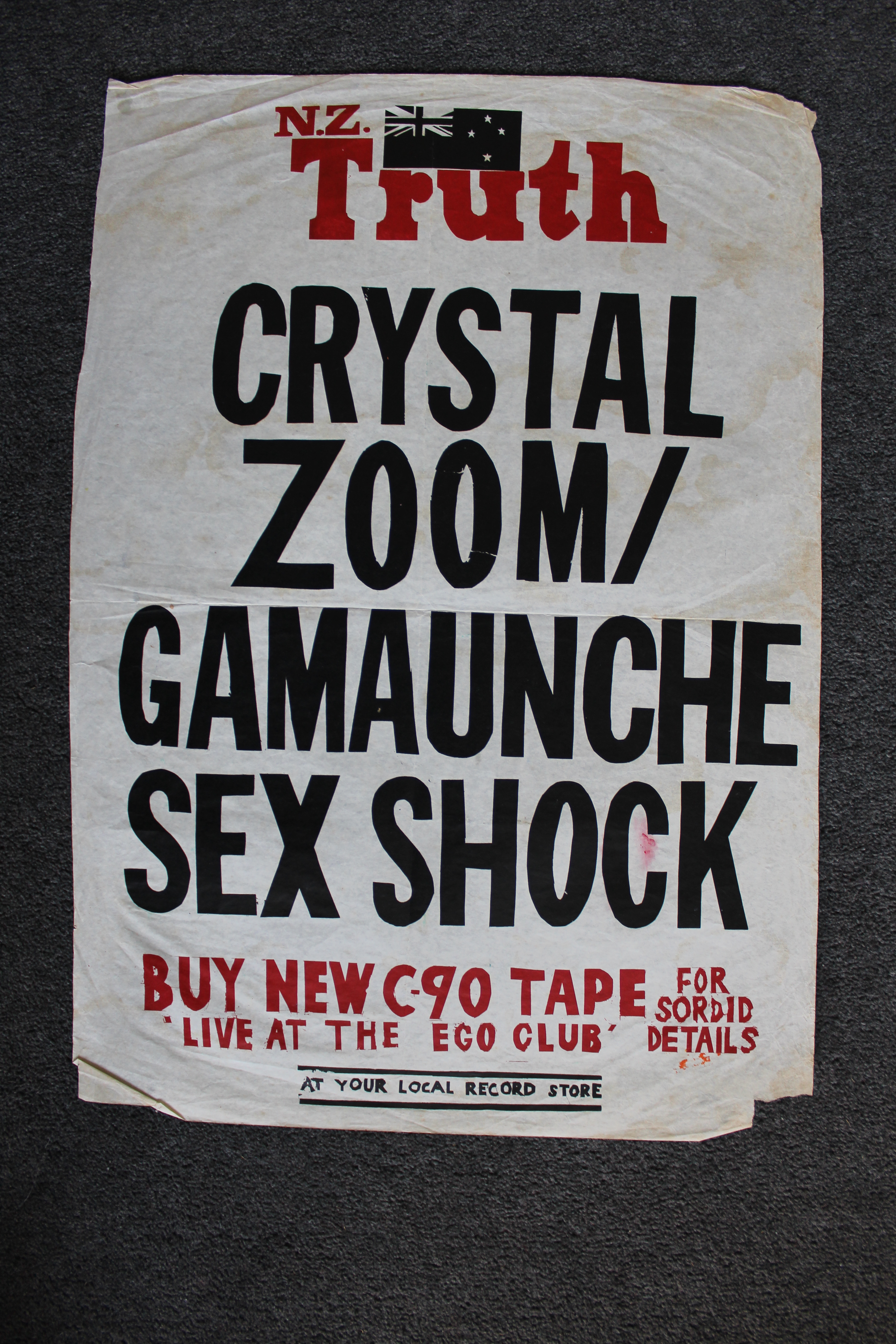 12) This poster promoted ‘Live at the Ego Club’ – Crystal Zoom’s second tape release which was recorded at The Empire Tavern in 1984 with Crystal Zoom on one side and Gamaunche on the other. The poster was printed by ‘The Axemen’ in Christchurch.