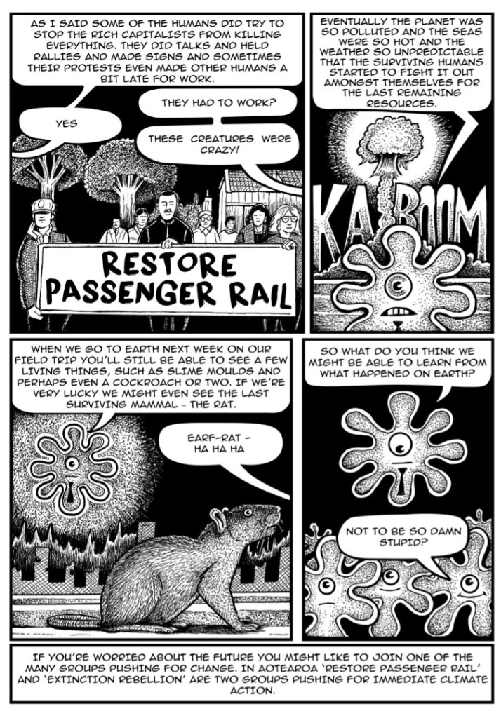 The first one, ‘The Coal Train News’ (2022) is about how government owned, KiwiRail, carry thousands of tonnes of coal around the country for Fonterra to burn to turn liquid milk into powder for export. The plan is to produce a book next year featuring all the best strips from ‘A Change in the Weather’ ( the weekly cartoon strip in the Otago Daily Times by Abe Hunter and myself) and some of the mini-comics. Huge thanks to Diane for her help scanning my drawings and inserting the text.