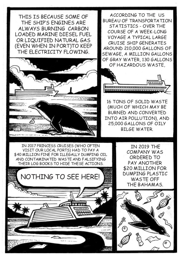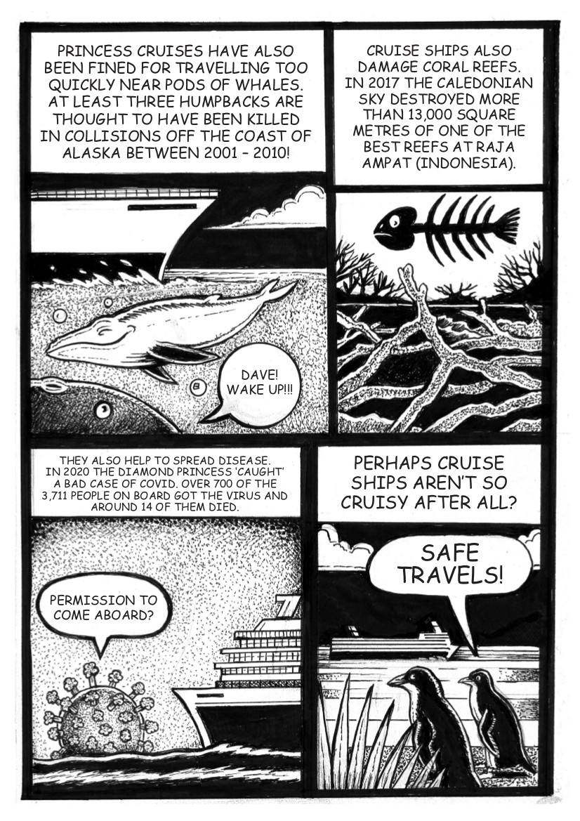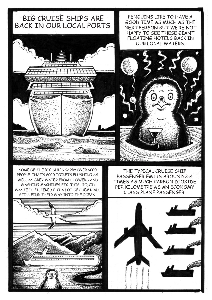 This is the third mini-comic I have produced about climate and pollution issues. This follows on and expands on the cartoons about the cruise ship industry I have written and drawn for the Otago Daily Times . My friend and colleague, Abe Hunter, inks them and adds the text.